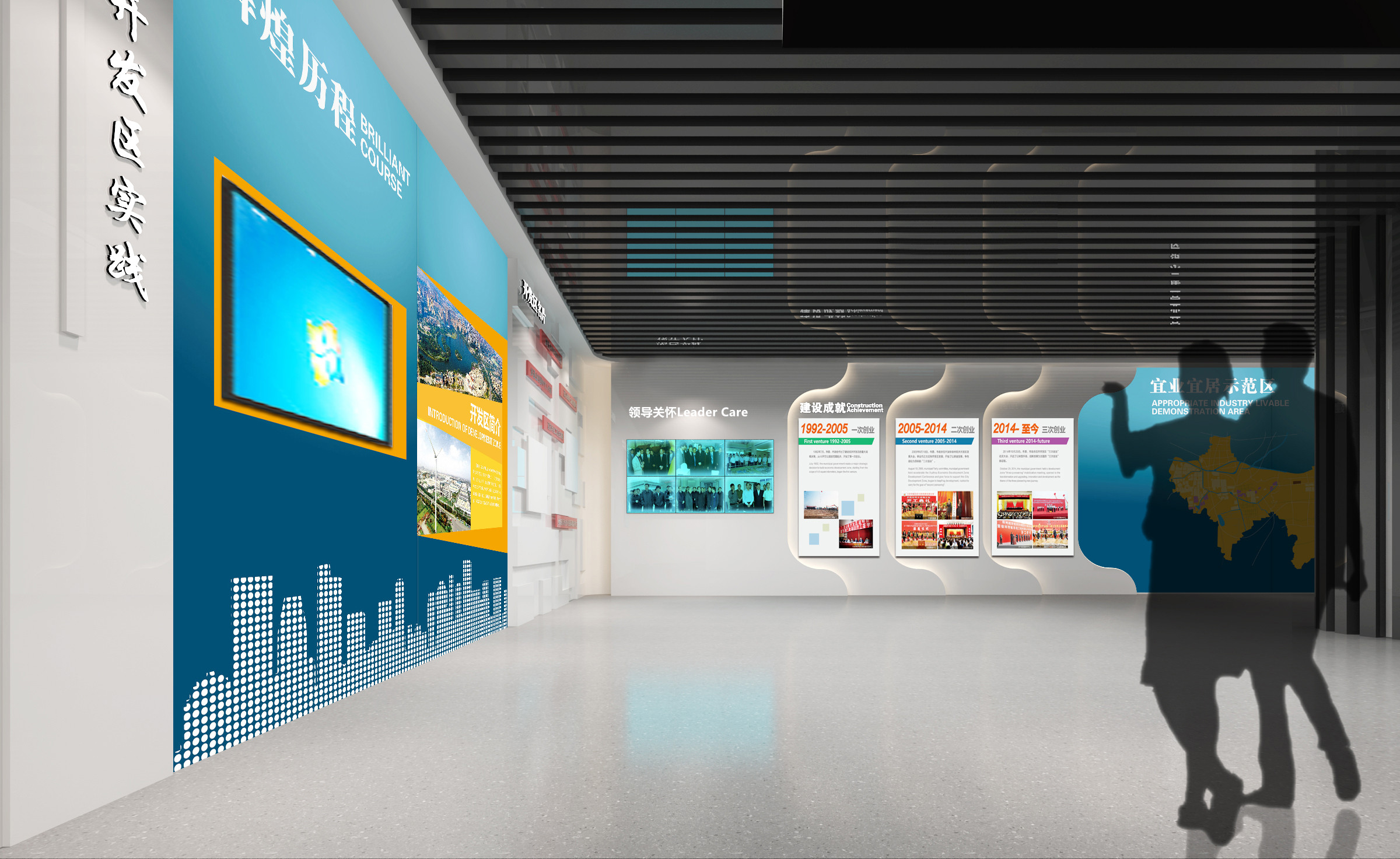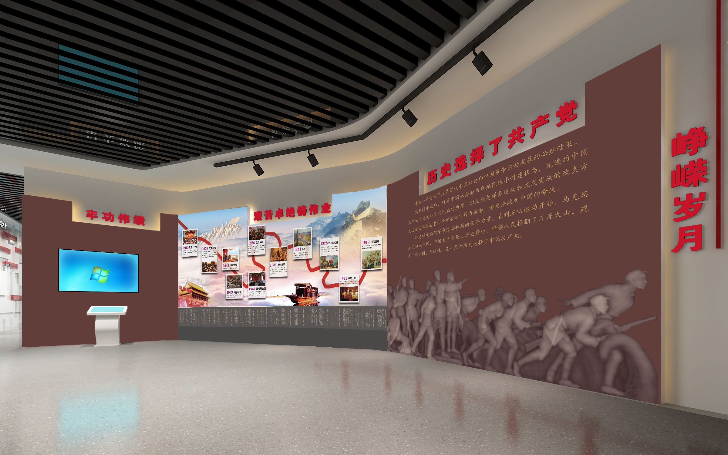 其中布展建筑面積約880平方米,共分為序廳、薪火相傳、開發(fā)區(qū)實(shí)踐、黨的建設(shè)、黨群建設(shè)等五部分,用流暢緊湊的參觀流線,系統(tǒng)展示徐州經(jīng)濟(jì)開發(fā)區(qū)全面貫徹黨的精神,緊緊圍繞“三次創(chuàng)業(yè)”的發(fā)展戰(zhàn)略,努力建設(shè)“經(jīng)濟(jì)強(qiáng)、百姓富、環(huán)境美、社會文明程度高”的升級版的國家級開發(fā)區(qū)的輝煌前景。另外配套設(shè)置了主題展廳、圖書閱覽室、黨員“創(chuàng)客”夢吧、群團(tuán)活動中心、心靈驛站、黨員教育室、遠(yuǎn)程教育室、接待室、咖啡吧、便民超市、辦公室、檔案室、流動黨員活動站、多功能廳等空間。